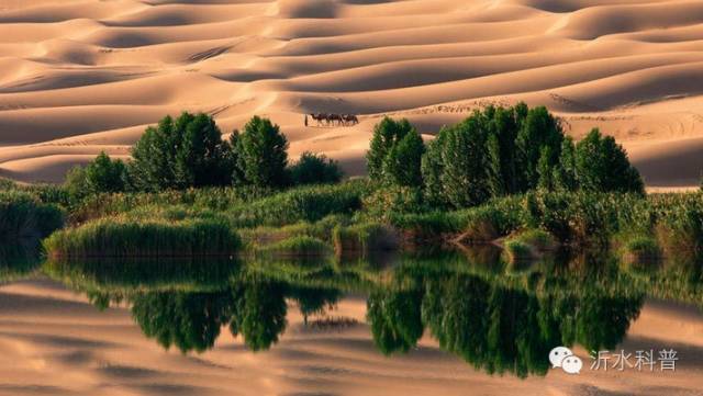 在干旱少雨的光禿禿的大沙漠里,也可找到水草叢生、綠樹成蔭,一派生機(jī)勃勃的綠洲。這綠洲又是怎樣形成的呢?原來高山上的冰雪到了夏天,就會融化,順著山坡流淌形成河流。河水流經(jīng)沙漠,便滲入沙子里變成地下水。地下水沿著不透水的巖層流至沙漠低洼地帶后,即涌出地面。另外,遠(yuǎn)處的雨水滲入地下,也可與地下水匯合流到沙漠的低洼地帶。或者由于地殼變動,造成不透水的巖層斷裂,使地下水沿著裂隙流至低洼的沙漠地帶沖出地面。低洼地帶有了水,各種生物就應(yīng)運(yùn)而生、發(fā)育、繁衍,于是形成了綠洲。沙漠里的綠洲,水源豐富,土壤肥沃,適合農(nóng)作物和其他植物生長。綠洲往往形成奇特的秀麗風(fēng)光。